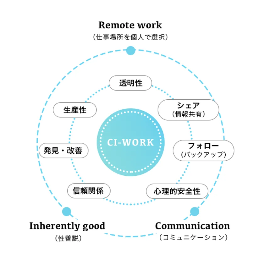 新型コロナウイルスによる緊急事態宣言前から自宅でのリモートワークを実施し、期間中の生産性・社員同士のコミュニケーション頻度が低下していないことから、2020年6月より、「Be connected,Everywhere」の概念を反映した新しい働き方「CI-Work」を開始しました。