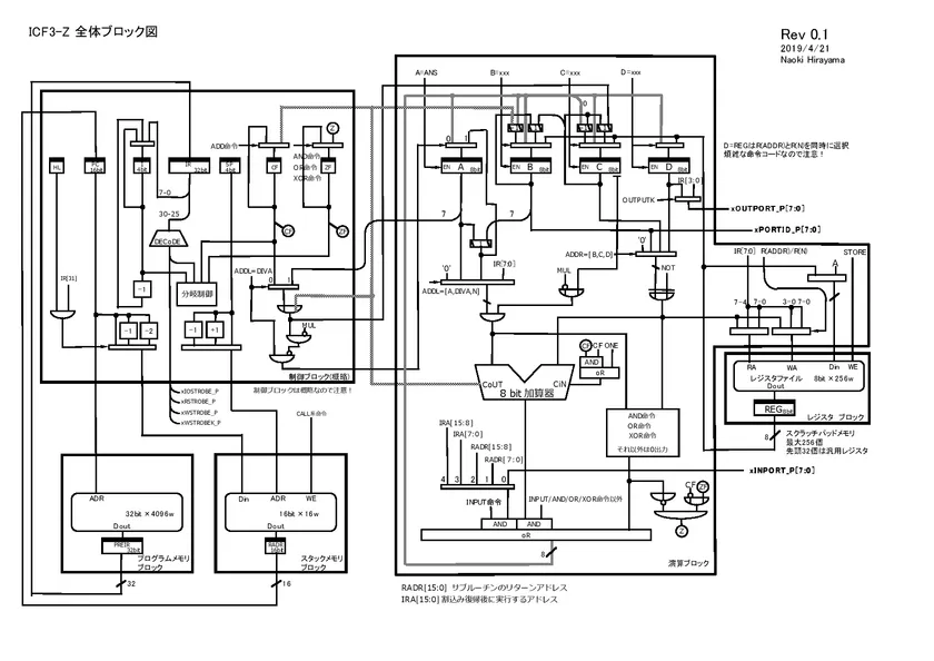 「ICF3-Z」の著作権者である平山 直紀(Naoki Hirayama)が1999年に世界一高速なRSA暗号プロセッサ(ICF3)を開発。米国の輸出規制のためIBMが自社の大型コンピュータの暗号装置を海外に販売することが厳しかったためか、この暗号プロセッサを搭載した日立の互換機(国内での名称はMP5600)が欧州などに良く売れました。RSA暗号プロセッサは専用演算器を駆動するために設計された軽量なプロセッサで、要求仕様がCPUとは異なるため、平山 直紀が1人で1から設計をしたもの。平山 直紀が2005年に退職するときに打合せをしてICF3を競合他社に持っていけることを日立製作所と約束。2017年に、この暗号プロセッサICF3をベースとして32bit CPUの開発を個人で始めましたが、他の32bit CPUの強敵を避け8bit CPUとして完成させ、2019年にインターネット上にオープンソースとして公開。制限の緩いオープンソースのApache License 2.0として2020年1月15日に公開をしました。なお暗号専用演算器はついていないため普通の8bit CPUと同じです。