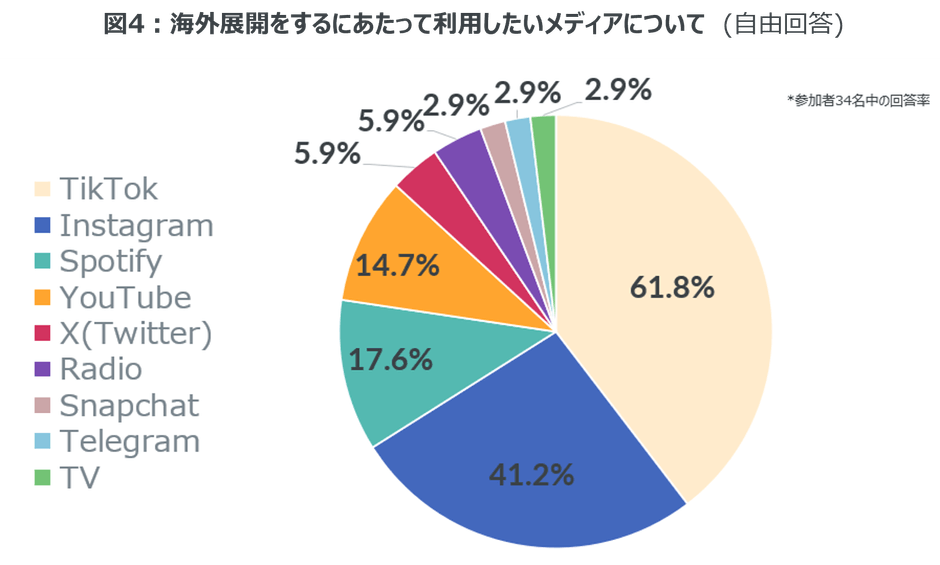 選曲した楽曲またはアーティストを海外展開するにあたりどういったメディアを活用するか、TikTokが1位の61.8%、Instagramが2位で41.2%、次にSpotify 17.6%、YouTube14.7%と続き4サービスがそれぞれ2桁の支持を得ており、イタリアの学生に身近なメディアであることが明らかになった(図4)。