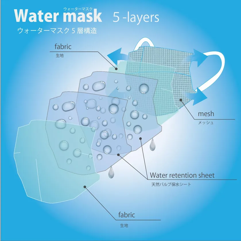 寝具・メディカル部門を持つメーカー株式会社オーシン(創業:133年、所在地:福井県越前市、代表取締役社長:渡辺 哲広)は2020年5月、暑さ対策として水で濡らして使用する「ウォーターマスク」の販売を開始しました。水分が蒸発する際周囲の熱を奪う気化冷却効果で口元がひんやり快適で繰り返し使用できます。