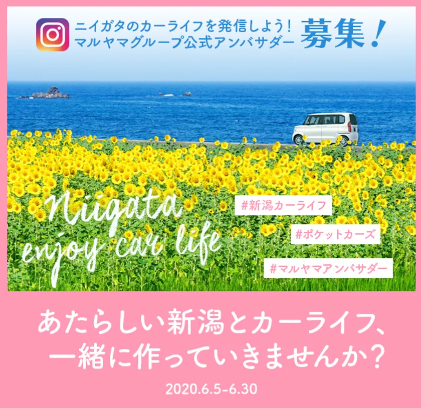 マルヤマグループ(株式会社丸山自動車、本社:新潟県三条市下須頃621-5、代表取締役:丸山 勇一、以下 マルヤマグループ)は、6月5日(金)~6月30日(火)まで、新潟のカーライフを発信いただけるマルヤマグループ公式アンバサダーの募集キャンペーンを開催いたします。