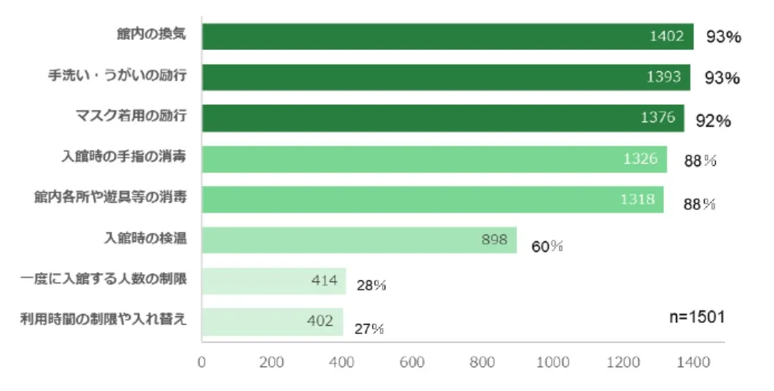 ほぼすべての児童館が「館内の換気」「手洗い・うがいの励行」「マスク着用の励行」など、感染症対策に取り組んでおり、3割の児童館が時間制限、人数制限を実施した。