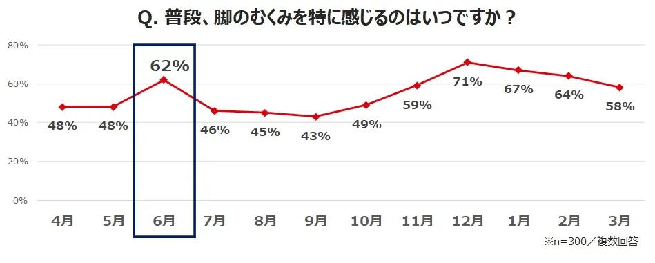 はじめに、普段、脚のむくみを感じる時季を月毎に調べると、上位の冬時季に続いて6割以上が「6月」と回答(62%)。春夏の時季の中では6月が最もむくみ実感率が高く、他の月に10ポイント以上の差をつけています。