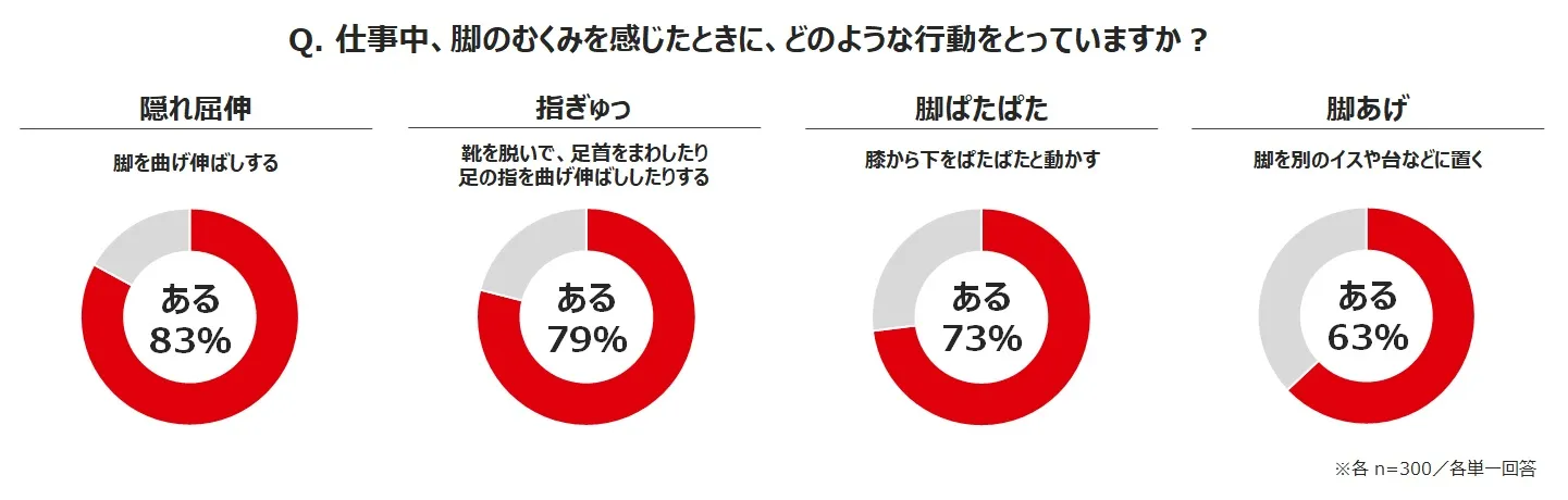 仕事中に脚のむくみを感じた際にとったことがある行動を調べると、「【隠れ屈伸】仕事デスクの下で脚を曲げ伸ばしする」(83%)、「【指ぎゅっ】仕事デスクの下で靴を脱いで、足首をまわしたり足の指を曲げ伸ばししたりする」(79%)、「【脚あげ】仕事デスクの下で、脚を別のイスや台などに置く(あげる)」(63%)など、過半数の女性がデスク下で脚を動かして対策をしていることが判明しました。具体的には「特にふくらはぎが重だるい。デスクの下で指で強く押したりマッサージしたりせずにはいられない」(47歳)といったコメントが多数見られ、仕事中であっても何かせずにはいられないむくみのつらさが感じられます。