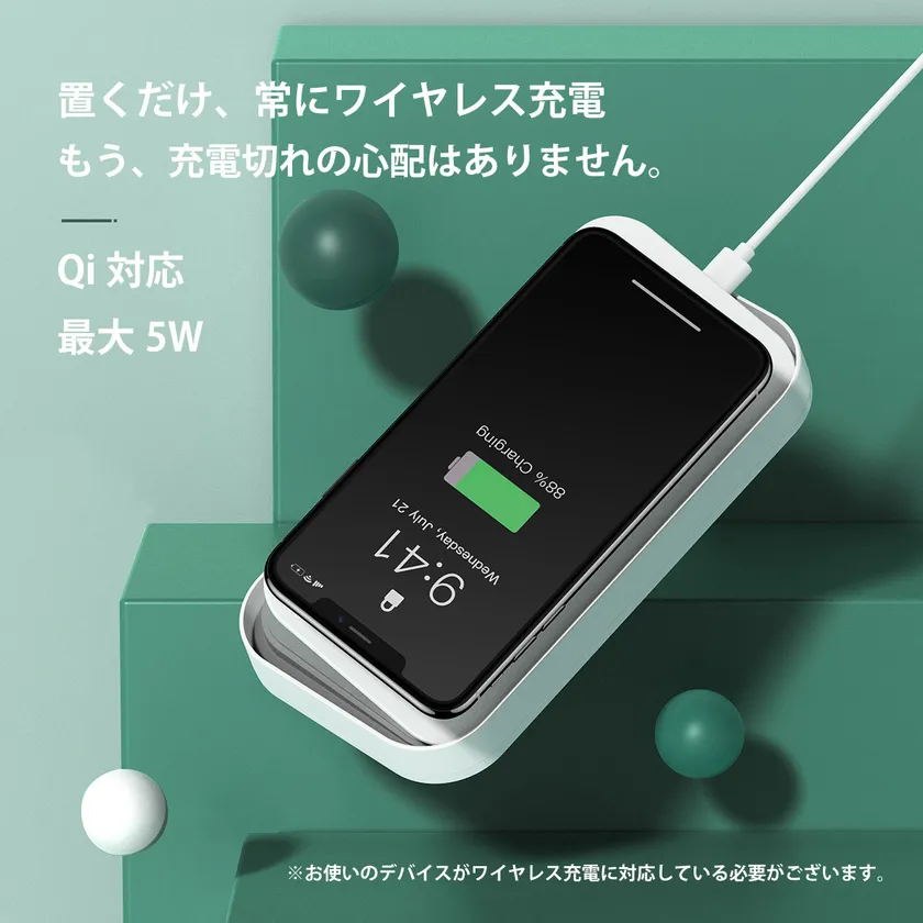 本体上部にスマホを置くだけで、ワイヤレス充電ができます。デスクや寝室などにおいて、常に充電することで、充電切れのストレスから解放されます。