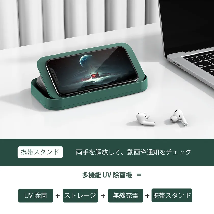 最大の特徴は、アコーディオンを採用したデザインによって、大容量な除菌スペースと、コンパクトさの両面を実現していることです。アコーディオンの片方側のみを畳むことで、スマホスタンドとしても活用でき、動画を見る際などに便利な作りとなっています。