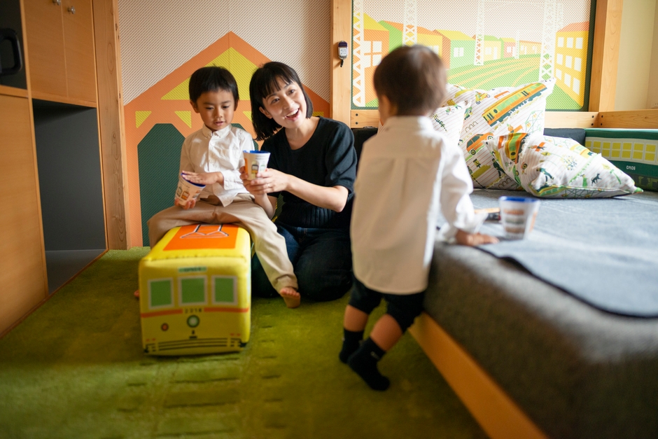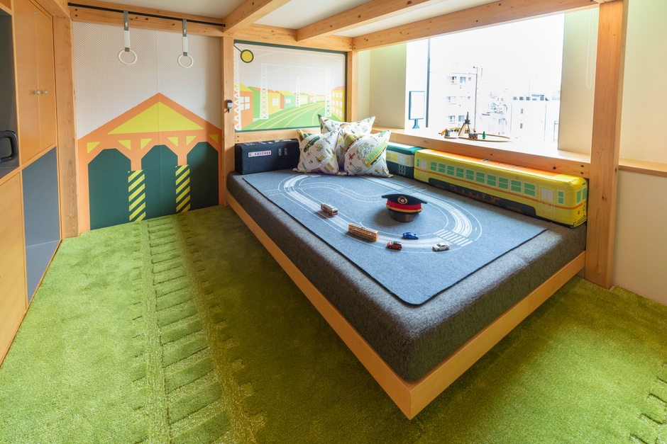 ソファの背もたれには、操縦レバーやボタンを模した飾りがついたクッションがあり、運転室のように楽しめます。運転士さんの帽子をかぶって、出発進行!クッションの上の壁紙には運転室から見える景色が描かれているので、まるで運転士さん気分で都電を運転しているような感覚のソファです。お部屋の中には実際に都電で使われていた、つり革や降車ボタンもあるので、家族で電車ごっこも楽しめます。さらにカーペットにも線路がデザインされているので、電車の模型を走らせたり、車両型クッションにまたがって乗ったりと、何通りもの遊び方があるのも都電ルームならではかも?!