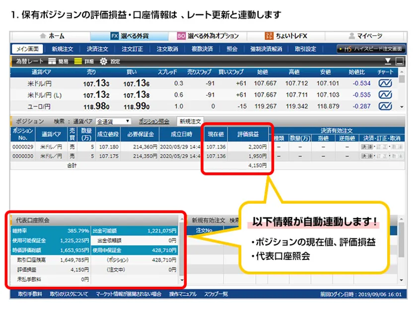 1.保有ポジションの評価損益・口座情報は、レート更新と連動します
