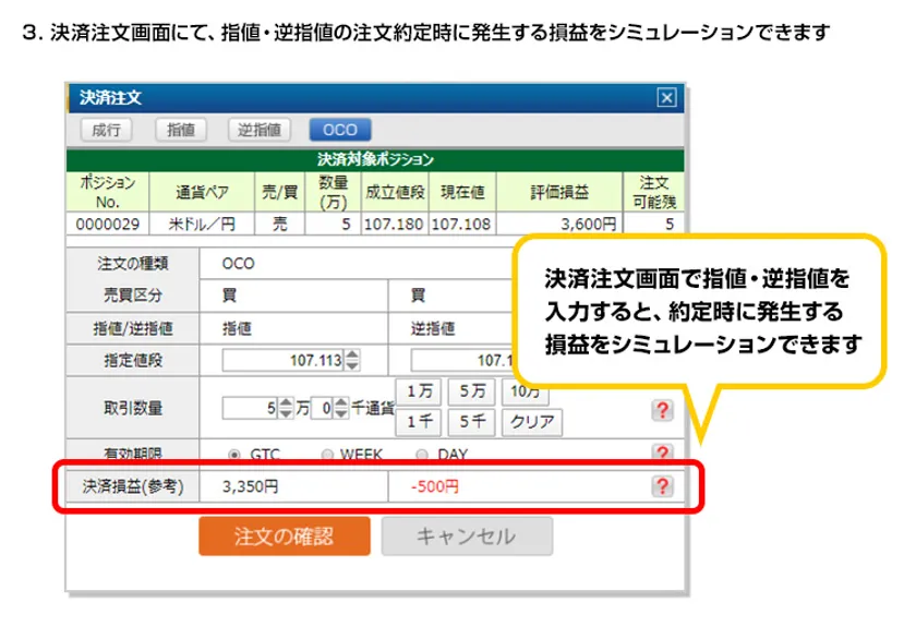 3.決済注文画面にて、指値・逆指値の注文約定時に発生する損益をシミュレーションできます
