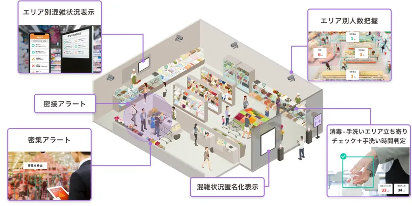 本ソリューションでは、すでに設置している防犯カメラにて撮影された映像をAIで解析することで、密集・密接の発生や、衛生管理状況を判定いたします。解析された結果を店舗や施設を利用されているお客様に確認していただくことで、安心して施設を利用いただくことができます。また、密集・密接状態となっているお客様への従業員の声掛けなどの新型コロナウイルス感染拡大対策活動を人が行う必要がなくなるため、不要なトラブルを招くこと無く、低コストで感染拡大対策を取ることができます。