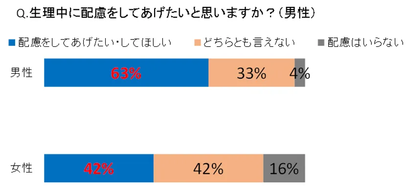◆男性の63%が、「生理中の女性に対して配慮をしてあげたい」と回答したことに対し、女性の42%が、「生理中に配慮をしてほしい」と回答。