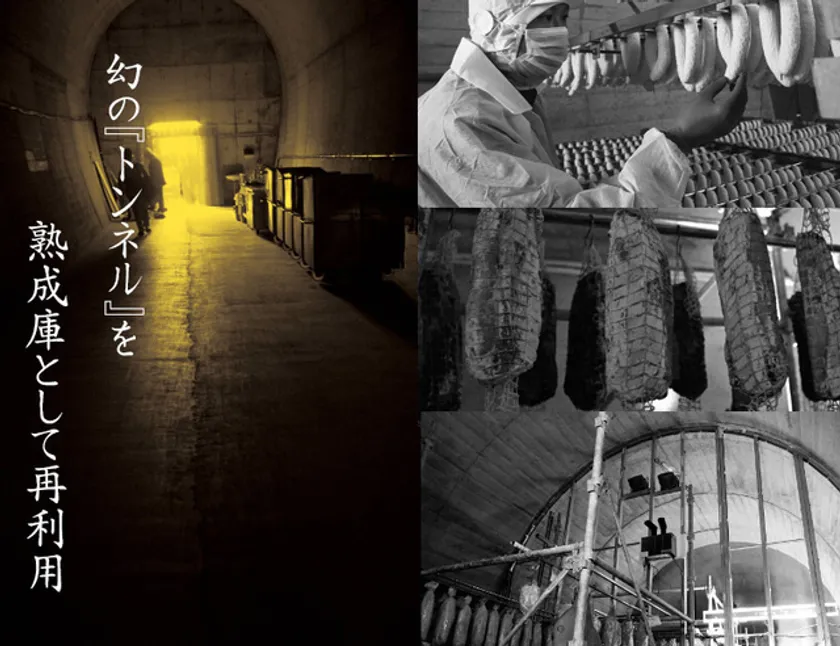 幻の路線となった呼子線の未使用の廃トンネルを有効活用しようと九州大学と唐津市と共同研究し、「トンネル熟成庫」を完成させました。さまざまな課題をクリアし、ヨーロッパの生ハムやサラミの熟成環境をトンネル内で再現、「トンネル熟成製法」を確立。