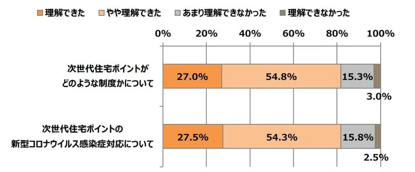 次世代住宅ポイント【新型コロナウイルス感染症対応】のHPを見て次世代住宅ポイントの【制度】、【新型コロナウイルス感染症対応】について、理解できたかを聴取。制度については「理解できた」と回答した方が27.0%、新型コロナウイルス感染症対応に関しては27.5%。