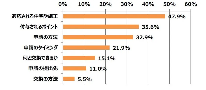 次世代住宅ポイントの公式サイトを見てもらい、わかりづらいと回答した方に対し、その箇所をお聞きしました。その結果、「適応される住宅や施工」が最も多く47.9%となりました。次いで、「付与されるポイント」35.6%、「申請の方法」32.9%と続きます。どのような住宅や施工が次世代住宅ポイントに適応されるかわからず、申請ができないという方も多いのではないでしょうか。