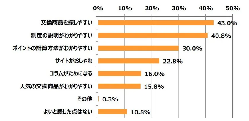 タクポについて「交換商品を探しやすい」43.0%、「制度の説明がわかりやすい」40.8%、「ポイントの計算方法がわかりやすい」30.0%と感じている方が多いことが調査から明らかになりました。前問で、公式サイトでは「適応される住宅や施工」がわからないと回答した方が最も多い結果となりましたが、タクポでは「制度の説明がわかりやすい」と回答した方が多くいらっしゃいます。