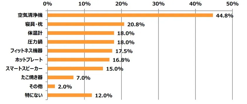 また、必要だと思うもの・欲しいと思うものが変わったと55.3%が回答。欲しいものランキングでは、第1位は「空気清浄機」となり44.8%が回答。他項目に大きな差をつける結果に。他にも「体温計」や「フィットネス機器」などコロナの影響が交換商品にも表れている。