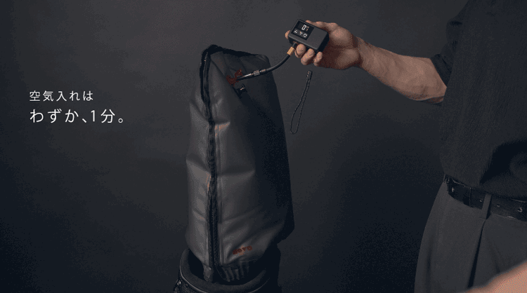 従来のハードケース(外側保護)とは逆の発想で、ゴルフバッグ内部に挿入し、専用ポンプで膨らませることでクラブ全体を包み込みます。5層独立エアチャンバー(5-Layer Air Cushion)が、移動中に想定されるさまざまな衝撃を受け止めます。