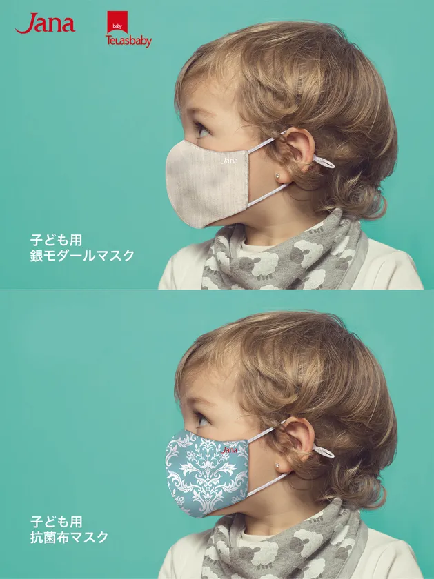株式会社ジャナ・ジャパンはこれまでベビー用品の開発を主に行っておりますが、マスク不足から特にお子さま用の布マスクが欲しいとのお声を多くいただき、この度快適性に優れた子ども用(2歳以上)・大人用の「銀モダールマスク」と「抗菌布マスク」のマスクを開発いたしました。