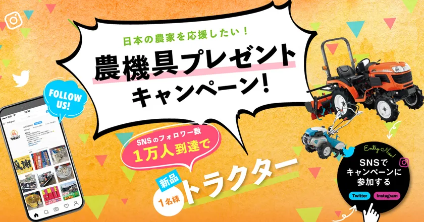 本キャンペーンでは、TwitterとInstagramで、農機具王公式アカウントのフォロワー数が増加するごとに農機具をプレゼント。2,500人達成で10名に刈払機、5,000人達成で5名にクボタの耕運機、1万人達成で1名にクボタのトラクターを進呈する企画です。さらに、フォロワーが1万人に到達するまで、2週間に1回のペースで、「iPad 128GB」などが当たるプレゼント企画も実施しました。