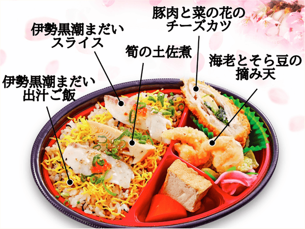 「桜鯛」とも呼ばれる春に獲れる鯛は、産卵前で脂がのっていることが特徴です。おかずには春が旬のそら豆・菜の花・筍も使用しており、春の味覚を存分に味わうことのできるお弁当に仕上がりました。