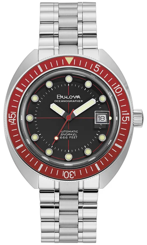 1970年代、水中時計は300フィート(約90m)防水が一般的でした。米軍に防水性が高く、高精度な時計を供給していたブローバは、ダイビング用にデザインした666ft(約200m)の防水性を達成した Oceanographer/“オーシャノグラファー”を発表しました。防水性を通常のM表記ではなくその水深数「666」を文字盤に刻みました。「666」という数字は聖書の黙示録で「獣の数字」と呼ばれ不吉な数字を意味することから、この時計は“Devil Diver”/“デビルダイバー”の愛称で呼ばれるようになりました。“デビルダイバー”の愛称の由来となった666ft(約200m)の表記や、立体インデックス、時分針などの特徴的なデザインを忠実に復刻し、また、サイズは当時のオリジナルにより近いケースサイズで登場です。オーソドックスなブラック文字盤にレッドベゼル、ブラックべゼルの2モデル展開です。