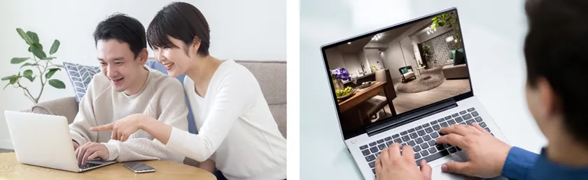 マンションギャラリーやモデルハウスへ来場せず、ご自宅で販売スタッフと対話しながら物件説明やモデルルーム見学、建物模型の説明やプランの検討、資金計画や住宅ローン相談などをオンラインで行うことができます。来場せずに同様の説明や見学を希望される場合だけでなく、来場前の情報収集や購入検討段階での質問への対応など、お客様のご要望に合わせてオンライン接客を提供していきます。