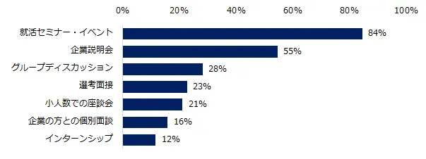 『iroots』に登録している22卒学生に、参加経験のあるオンラインでの就活イベントについて伺うと、最も多かったのは「就活セミナー・イベント」(84%)でした。次いで「企業説明会」(55%)が続きます。