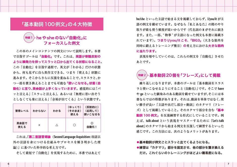 続く本書の題材は、いわゆる「英会話におけるBIG3」となる「20 の基本動詞」です。ネイティブがよく使い、初級者が上達を実感できる動詞を厳選。それらを100 の例文パターンにし、1日60分、1ヵ月間反復トレーニングしていく構成です。
