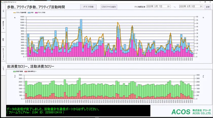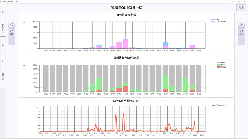 AM550Nは、NFC通信機能を搭載。専用Windowsアプリ「AWDS_PDV」に、測定データを転送し、データを簡単に確認・管理することができます。日ごとの歩数やアクティブ歩数グラフに加え、1時間ごとの歩行の状況と運動強度をグラフで確認することができ、1日の活動状況を詳しく確認することができます。