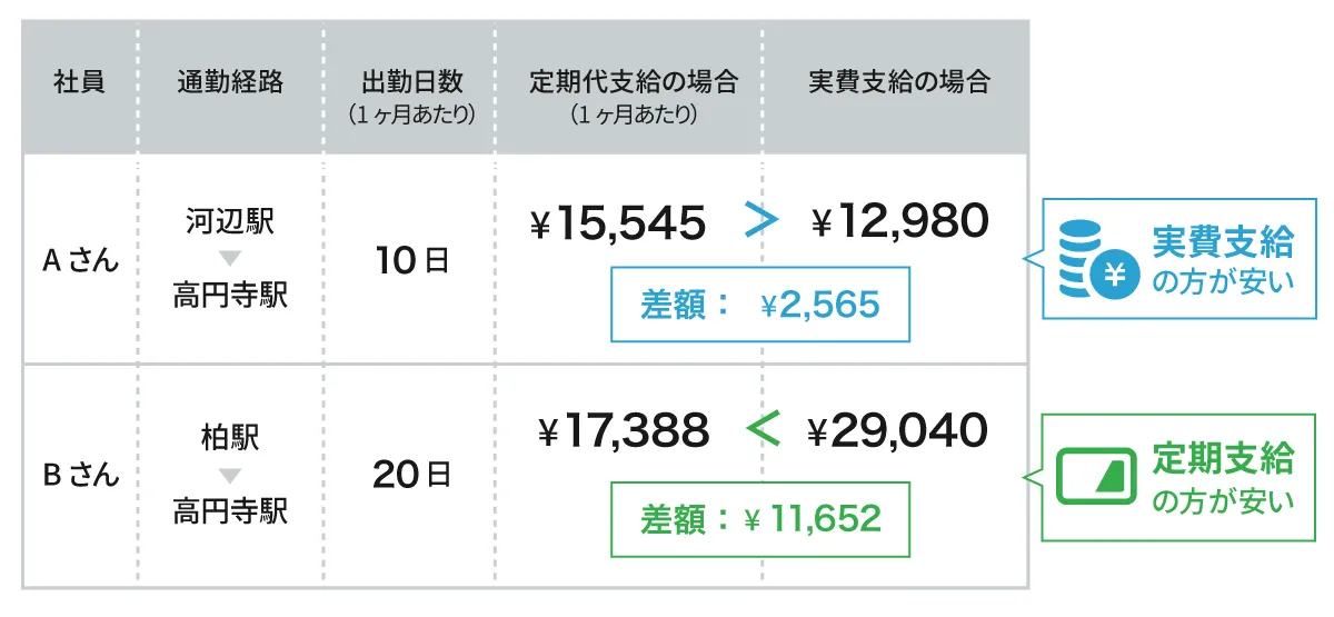 月の出勤日数が20日のBさんの場合、実費支給よりも定期代支給の方が安い結果となります。