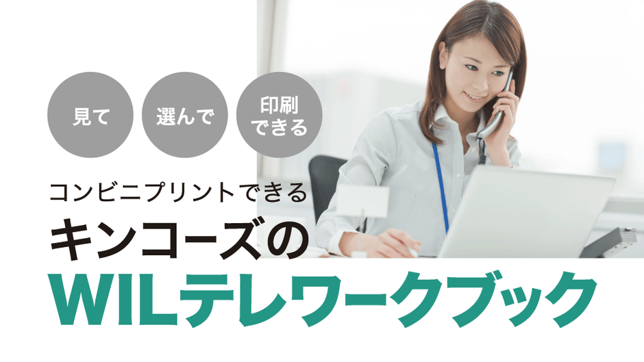 そこで、キンコーズではカタログや提案資料などを電子カタログ化する『eカタログ』サービスと、全国約50,000店舗のコンビニエンスストアで個人の費用負担なしにプリント出来る『コンビニdeプリント』サービスをセットにした『WILテレワークブック』を開発しました。