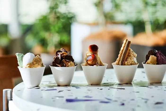 天然の「オットローズ」のオイルを練って、バラの花びらに見立てたチョコレートや、香り豊かな泡のムース、商品として販売もしているチュイルサンドクッキーの「Nami-Nami」といったこだわりの材料をトッピングします。1つ1つに込められた味の背景を想像しながら、お楽しみください。