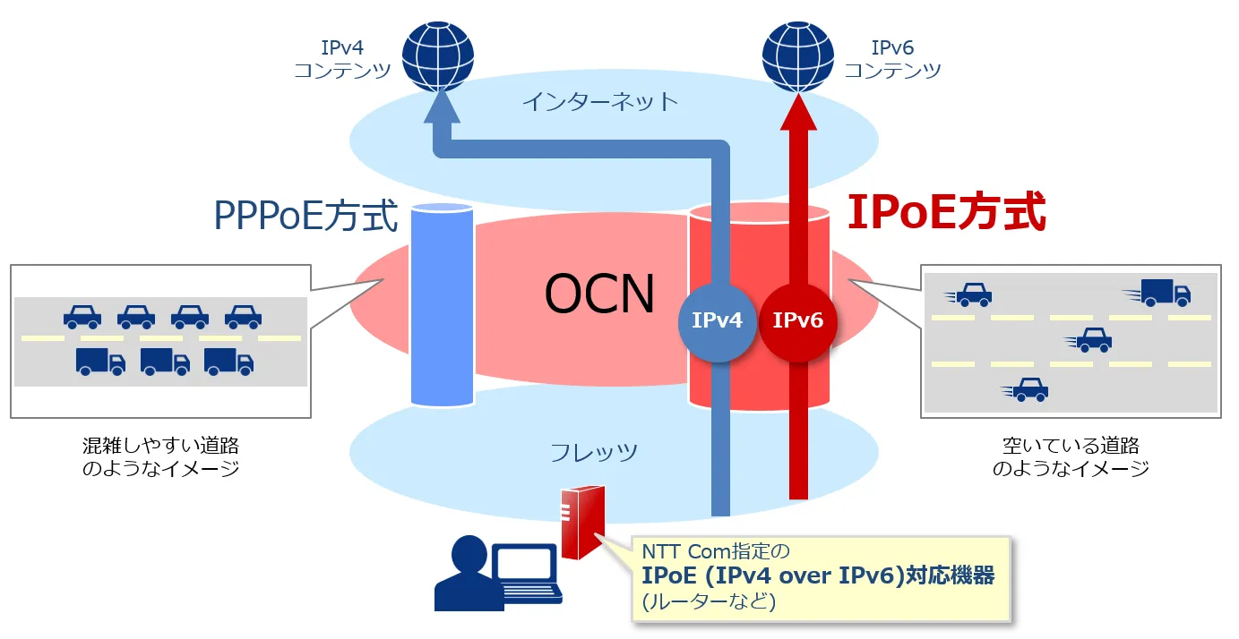 IPoEとは、従来型の接続方式であるPPPoE(※1)に代わる接続方式です。またIPv4 over IPv6とは、IPv4の通信も、IPv6の通信と同様にIPoE方式によって通信することを指しています。