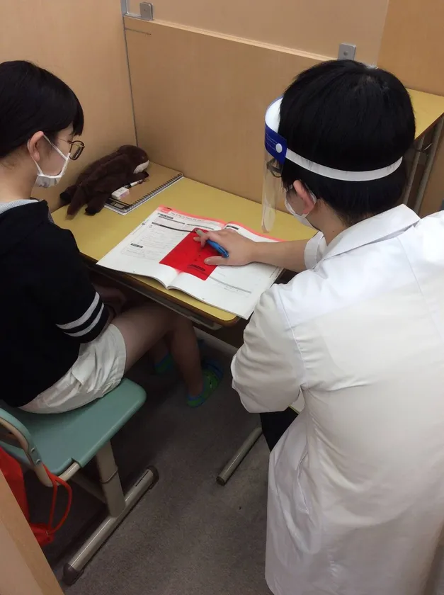 教室での飛沫感染防止策として、講師全員がフェイスシールドを着用しています。