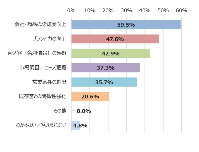 「会社・商品の認知度向上」が59.5%でトップ、次いで「ブランド力の向上」が47.6%、「見込客(名刺情報)の獲得」が42.9%