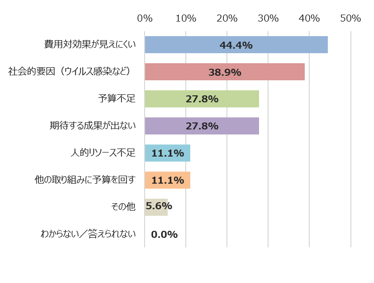 44.4%が「費用対効果が見えにくい」、次いで38.9%が「社会的要因(ウイルス感染など)」をその主な要因として挙げたことが判明