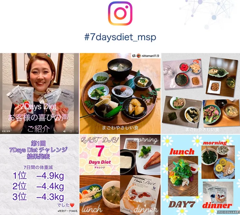 7Days Dietのチャレンジャーが、7日間のダイエット中におすすめの食事や食べ方など、ハッシュタグを使用して投稿。仲間と一緒に楽しい7日間のダイエットを続けられるように工夫しました。
