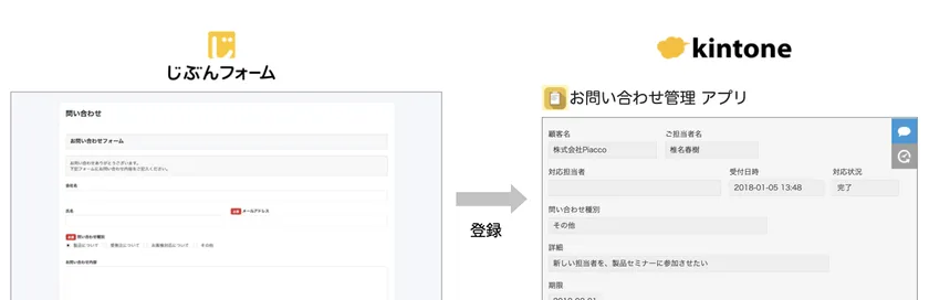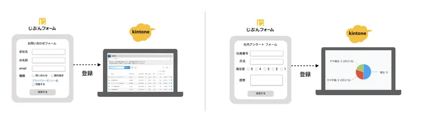 じぶんフォームはkintoneと連動したWEBフォームが簡単に作成できるサービスです。じぶんフォームを利用すればフォームに登録したデータが自動的にkintoneへ保存されます。