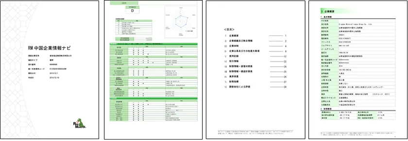 リスモンと提携する中国現地調査会社の調査結果を、レポート形式にまとめた資料で、企業の基本情報、沿革、代表者情報、許認可情報、訴訟情報、取引先情報などが記載されているほか、それらの情報を基にリスモン独自のノウハウで分析した企業信用格付「RM格付」も付与いたします。これにより、国内企業と同様にRM格付で取引判断基準を定め、与信ルールを構築・運用することができます。