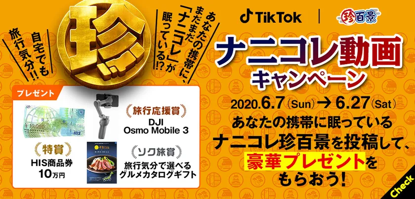 ショートムービープラットフォーム「TikTok(ティックトック)」は、テレビ朝日系列にて毎週日曜日18時30分から放送の「ナニコレ珍百景」とコラボレーションし、「珍百景|TikTok ナニコレ動画キャンペーン」を2020年6月7日(日)より実施いたしました。本キャンペーンは、TikTokの【動画アップロード+楽曲利用機能(ナニコレ珍百景の音楽)】を使用して、携帯に眠っている過去の旅行先や身近なお店の珍百景などを、「#珍百景」「#ナニコレ珍百景」のタグを付けて投稿すると、抽選で豪華プレゼントが当たります。また、本キャンペーンで選ばれた投稿は、6月28日(日)のナニコレ珍百景にて放送されます。皆様の「ナニコレ?」な思い出映像のご応募をお待ちしております。