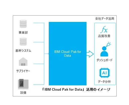 新たに導入する「IBM Cloud Pak for Data」は、データを収集、編成、分析するためのデータ活用プラットフォームです。例えば、各工場内でシステムごとに蓄積されているさまざまなデータを統合し、工場内で日々生成される膨大なデータをリアルタイムにAIで分析し、さらなる洞察を得られるようになります。