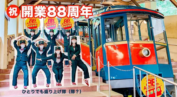 六甲山観光株式会社(本社:神戸市社長:宮西幸治 阪神電気鉄道株式会社100%出資)が運営する六甲ケーブルでは、2020年3月10日(火)に開業88周年を迎えました。写真では三密を防ぐため、1人でがんばっておりますが、青空と緑が広がる六甲山の玄関口として、駅員一同心を込めてお客様をお迎えいたします。つきましては、日ごろのご愛顧と六甲ケーブルにより親しんでいただきたいと考え、7月4日(土)から「六甲ケーブル88周年記念オリジナル缶バッジプレゼントキャンペーン」を実施します。