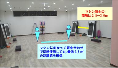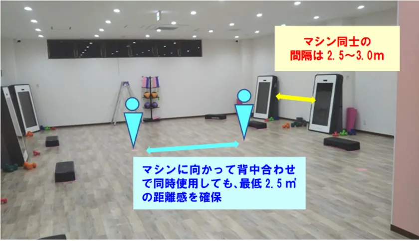 各AIマシンの間隔は2.5~3.0m確保しており、これにより「密接」となる機会を極力少なくし、濃厚接触のリスクを低減できます。また、営業時間中は常時換気設備をフル稼働し、定期的に店内の空気の入れ替えを実施することで「密閉空間」のリスクを低減できます。更に、呼吸が粗くなるようなトレーニングを控えていただくよう個別プログラムを設定。より負荷の少ないメニューへの変更が可能です。