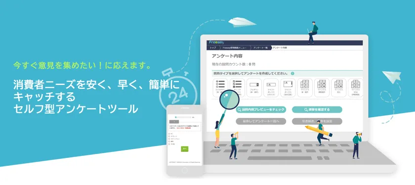 Freeasyは、初期・月額不要の24時間365日いつでも450万人の調査モニタへネット上でアンケートが実施できるサービスです。500円からアンケートを気軽に作成できるツールとして、メーカー様をはじめ様々なお客様にご利用いただいております。これまでネットリサーチ実施の際に必要だった手間を省くことで、最短で10分後にアンケートを開始することができ、急な社内会議や急遽データがほしい時でも間に合います。