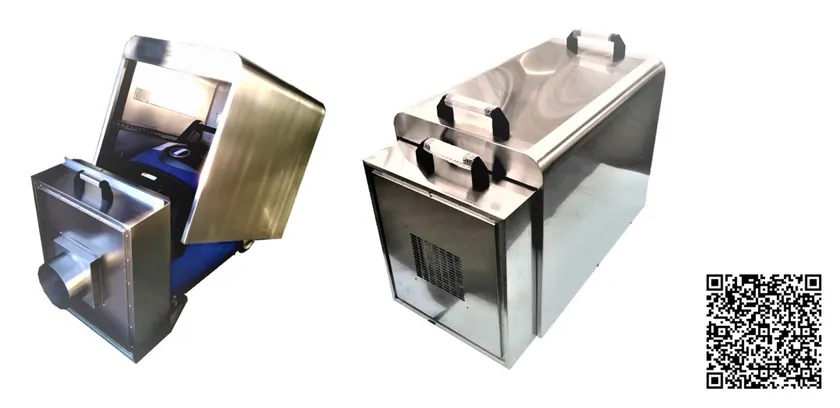 防音部の排気カバー、本体カバーは大型のハンドルが付き、それぞれ一人で持てる様になっています。