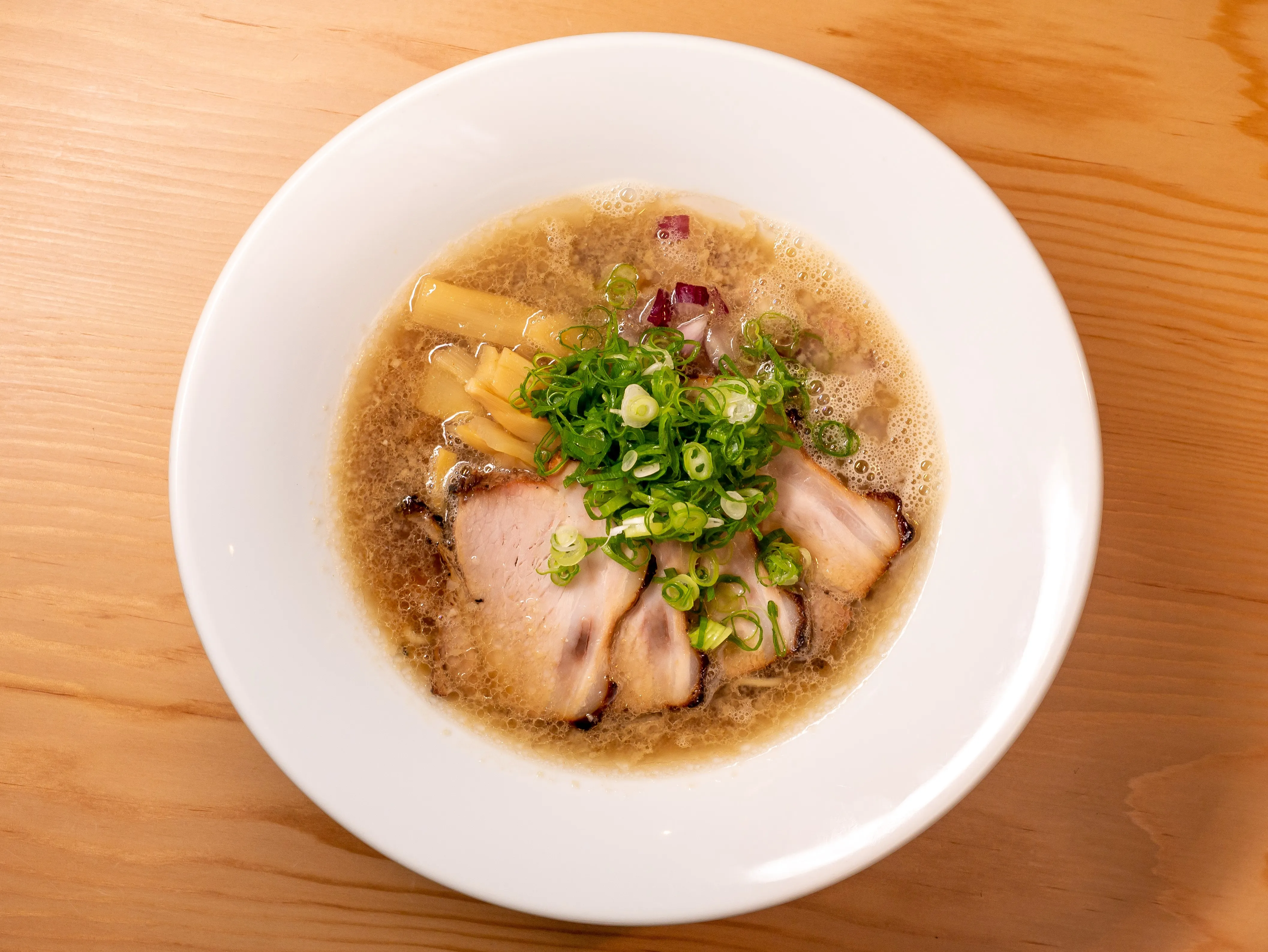 豚骨をベースに魚介スープをブレンドしたWスープ。コクがありながらすっきりとした後味で最後の一滴まで飲み切ることができる味わいに仕上げています。素材にも京の素材をふんだんに使い、京都のラーメンを表現。麺には京都の老舗ラーメン店も御用達の「近藤製麺」のものを、ネギは京都の圃場で育まれた「京都知七」の九条ネギを、チャーシューには「京の都 もち豚」を使用。チャーシューは煮込んだ後、オーブンで焼き上げることで豚肉のうまみとともに香ばしさが楽しめます。