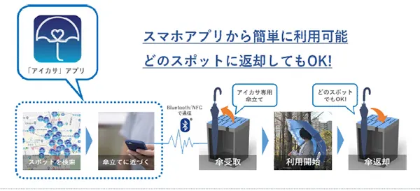 「アイカサ」は、1日70円で傘をレンタルし、「アイカサ」の傘立てであれば、どの傘立てでも返却が可能なシェアリングサービスで、関西では初めての導入です。