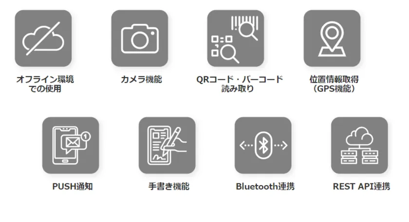 また、QRコードの読取や位置情報の取得、手書きメモの入力など、ユーザーの使い勝手を向上させる機能も簡単に使うことが可能です。