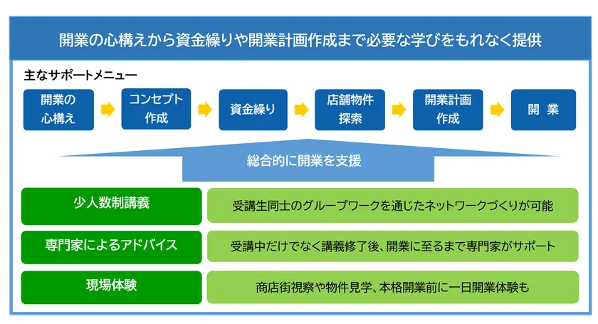 ※本事業を利用することで、若手・女性リーダー応援プログラム助成事業、商店街起業・承継支援事業、創業助成金の申請資格が得られます。