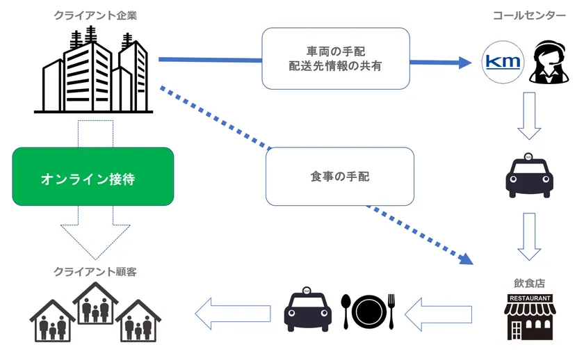 緊急事態宣言が解除され「ウィズコロナ」における重要顧客に接待を行う企業においても「新しい生活様式」が求められています。厚生労働省が公表した「新しい生活様式」では食事のデリバリー、対面ではなく横並びで座る事、おしゃべりは控えめにすることが推奨されています。国土交通省が道路運送法に基づく特例措置として、タクシー事業者による有償貨物運送の特例の通達が出されたことに伴い、国際自動車はオンライン接待を行う企業に代わりタクシーの利便性を活かした飲食物の配送を行います。国際自動車は、オンライン接待を行う企業、及び飲食業界の維持・発展・支援に取り組みます。